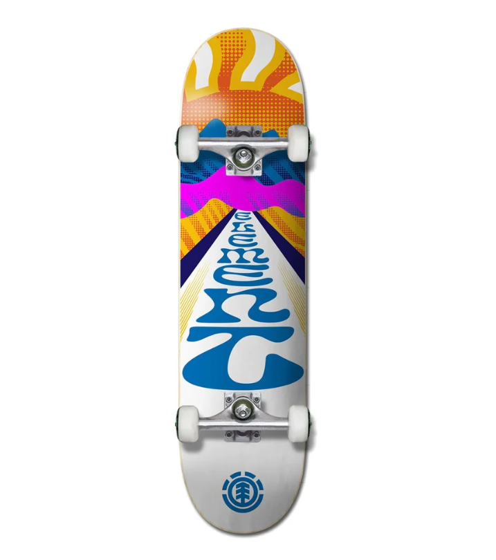 Element brings the Eyeota skateboard complete measuring at a width of 8.0″ and a length of 31″, displaying a colorful retro-style image of a setting sun with the brand name running down the center. This skateboard comes ready to ride with 5.25″ Element trucks